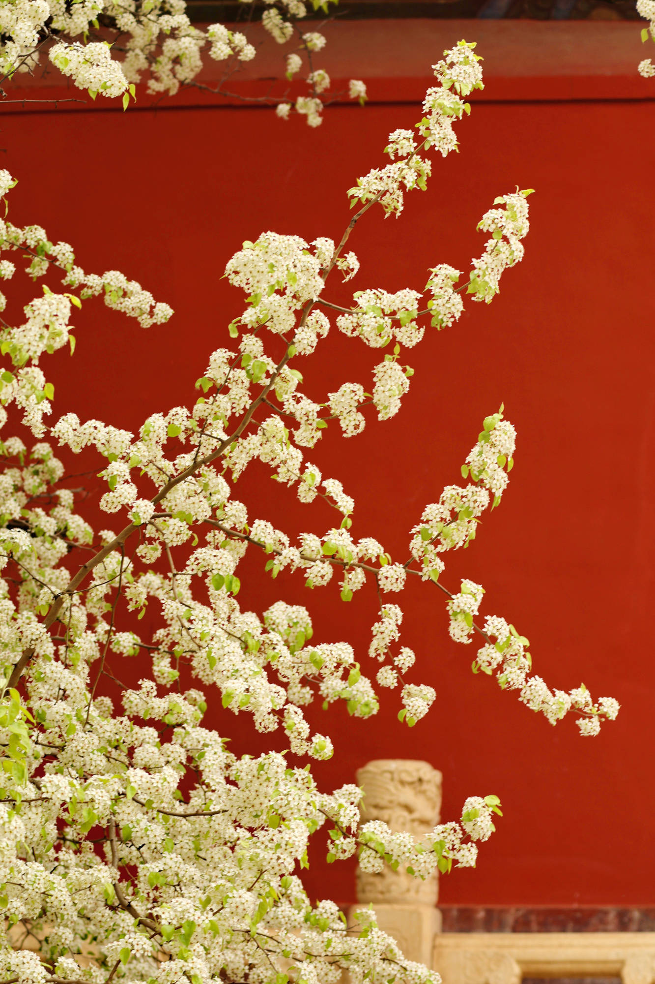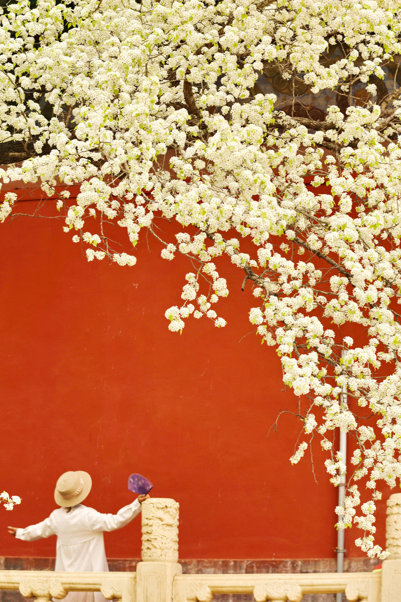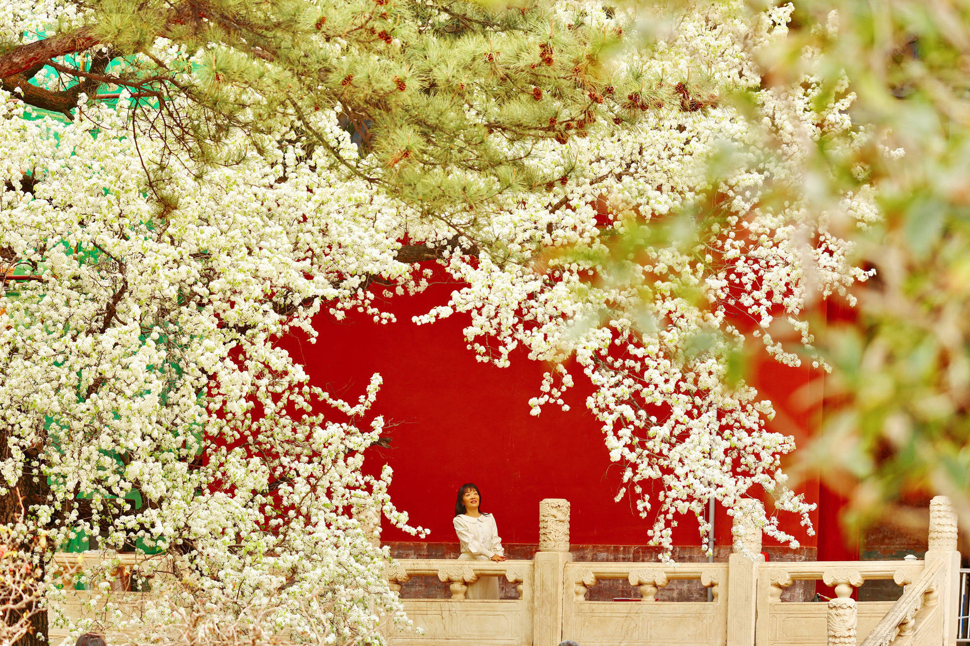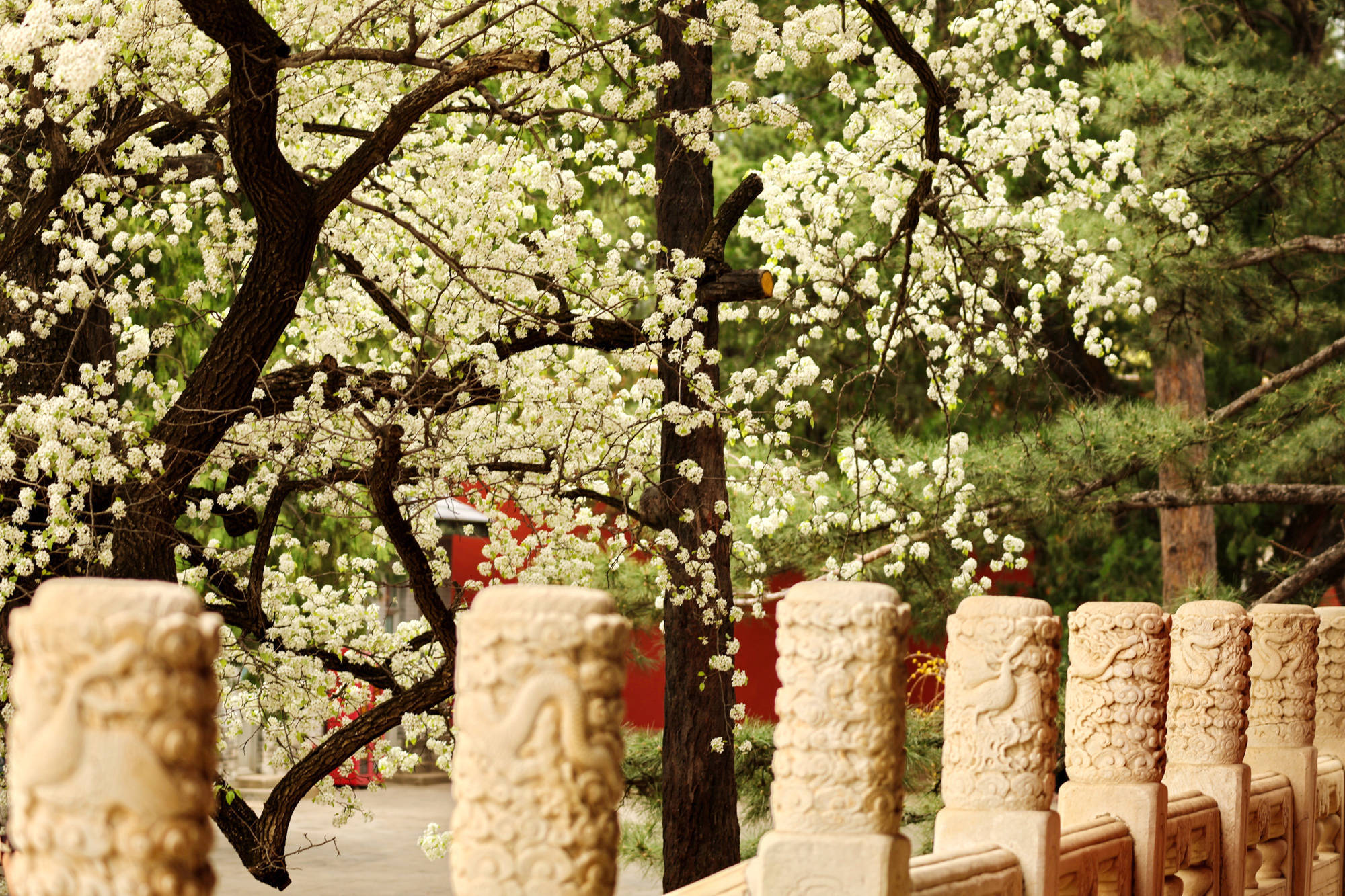 近日,北京昌平区明十三陵长陵景区内杜梨花盛开,将这座皇家陵寝装扮得绚烂多姿,吸引游客前来观赏拍照。